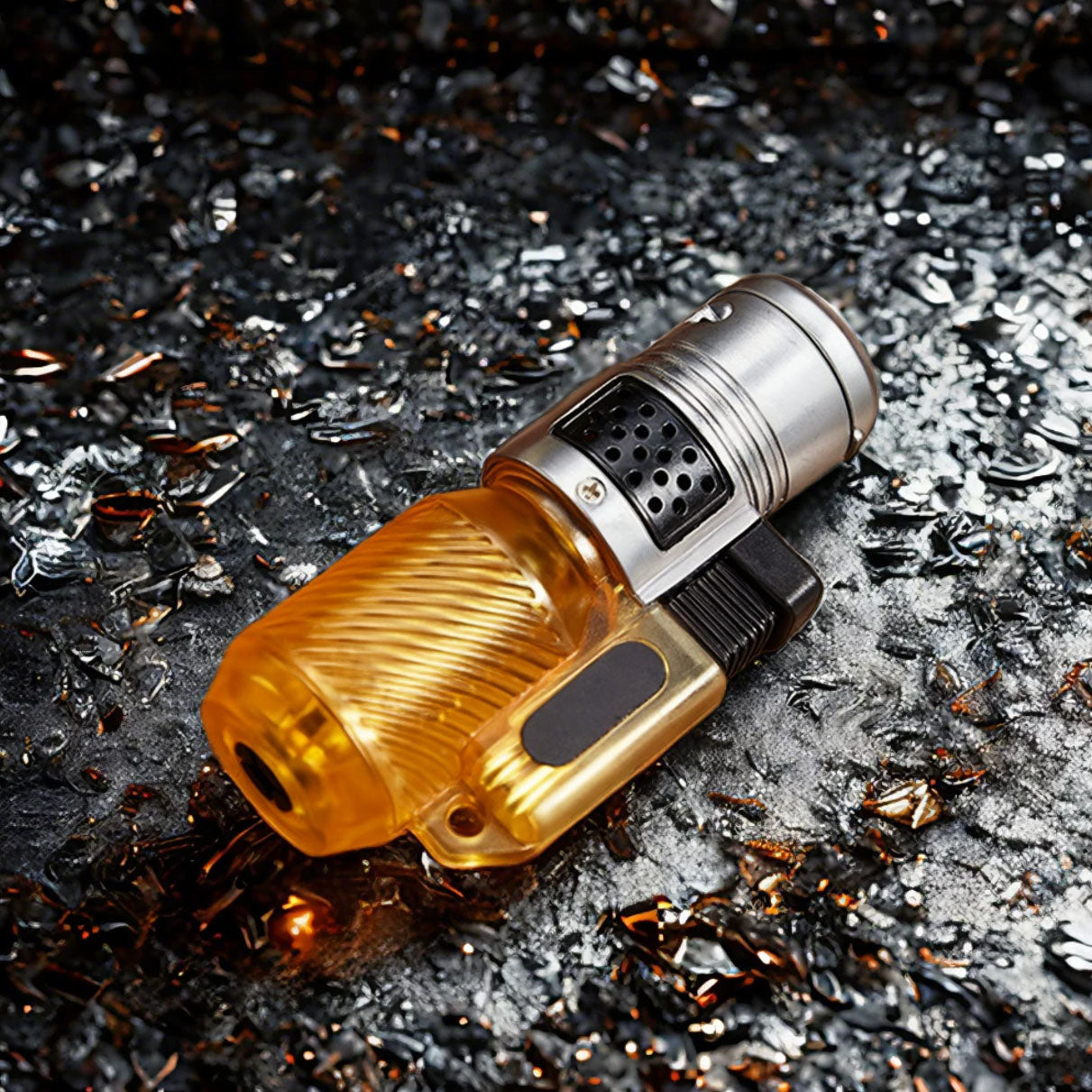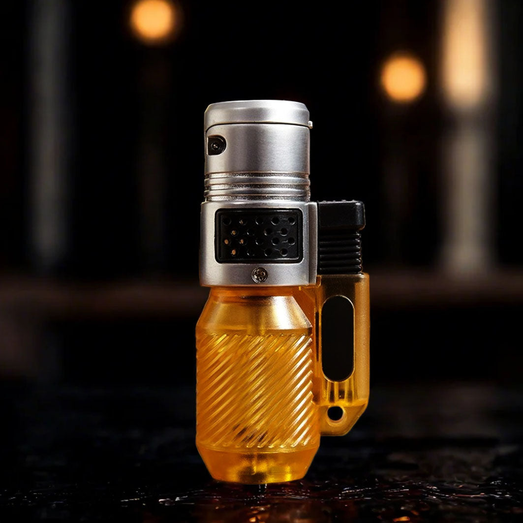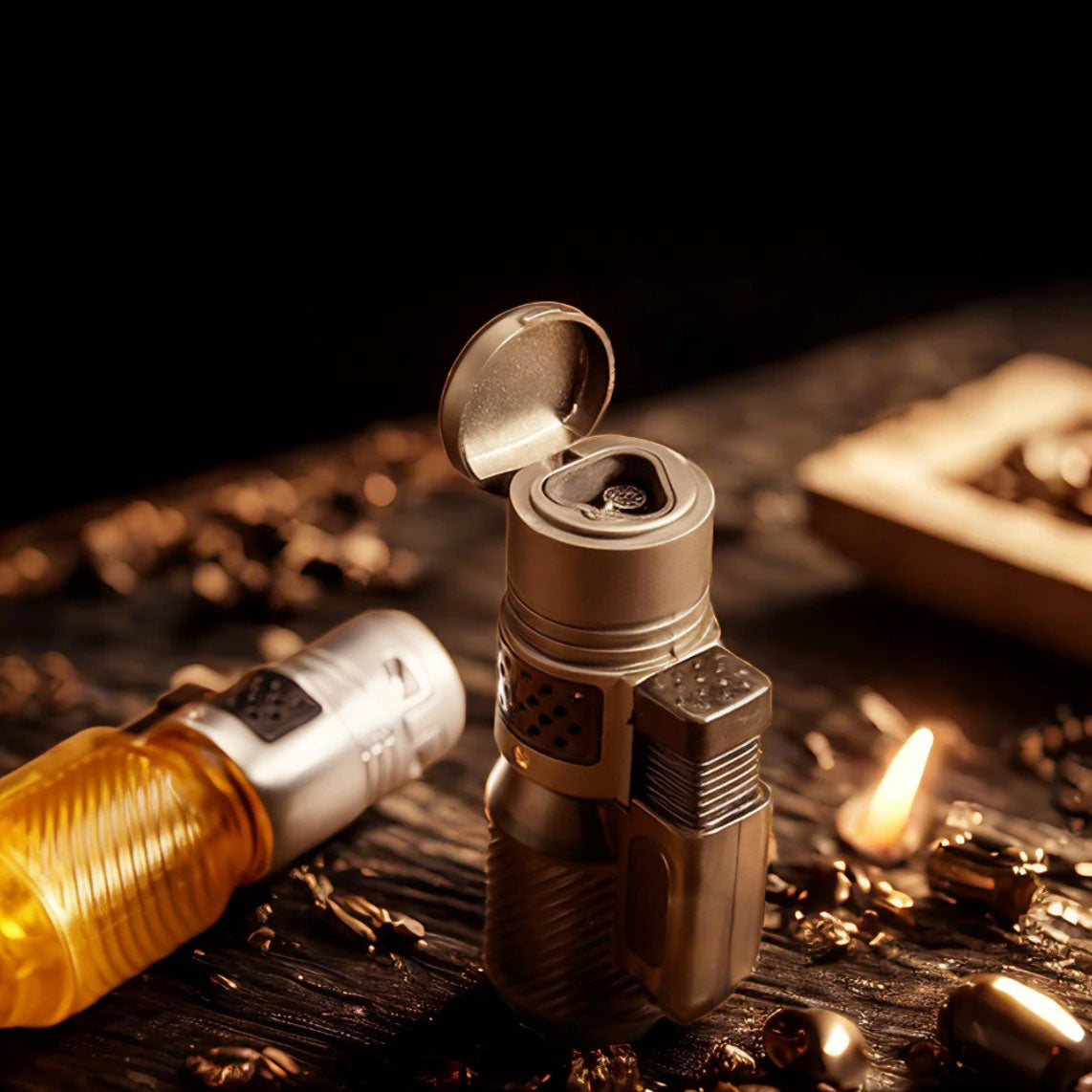 Its solid metallic body is wrapped in a textured, high-friction grip for better stability, complemented by a protective cap and mechanical press ignition system. Whether you’re hiking rugged terrain or indulging in premium cigars, this lighter is ready for both performance and ritual.